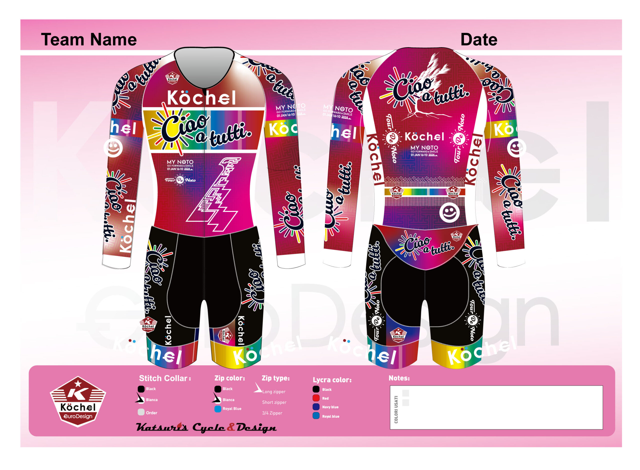 コンマ1秒を競うトラック種目で着用されるのが、ワンピース状のスキンスーツです。スキンスーツもレース用なので、半袖ジャージと同じデザインとなります。来季はトラックの選手も所属する事になったので、当然必要になってきます。最高速を求めるための、フォーマルウエア―です。